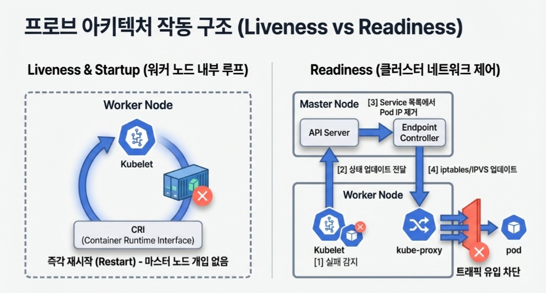 모든 프로브의 실행 주체는 각 워커 노드(Worker Node)에 상주하는 Kubelet입니다. Kubelet은 파드 스펙(Pod Spec)에 정의된 메커니즘에 따라 컨테이너의 상태를 직접 확인합니다.