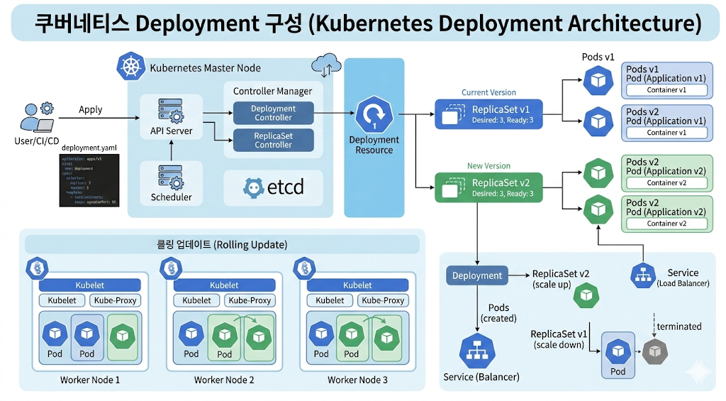 오늘은 쿠버네티스(Kubernetes)를 사용하면서 가장 빈번하게 접하고, 실제 운영 환경에서 애플리케이션 배포의 표준으로 자리 잡은 **Deployment(디플로이먼트)**에 대해 다루어 보겠습니다.