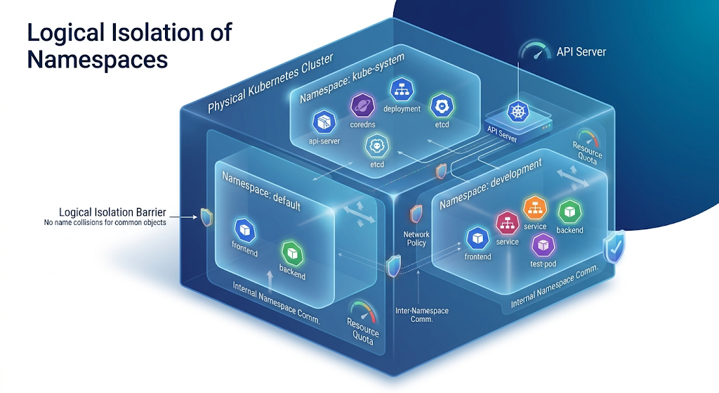 더 쉽게 이해하기 위해 컴퓨터의 ‘폴더(디렉토리)’ 구조를 떠올려 봅시다. 하나의 하드디스크(클러스터) 안에 여러 개의 폴더(네임스페이스)를 만들고, 각 폴더 안에 서로 다른 프로젝트 파일(오브젝트)들을 정리하는 것과 같습니다.