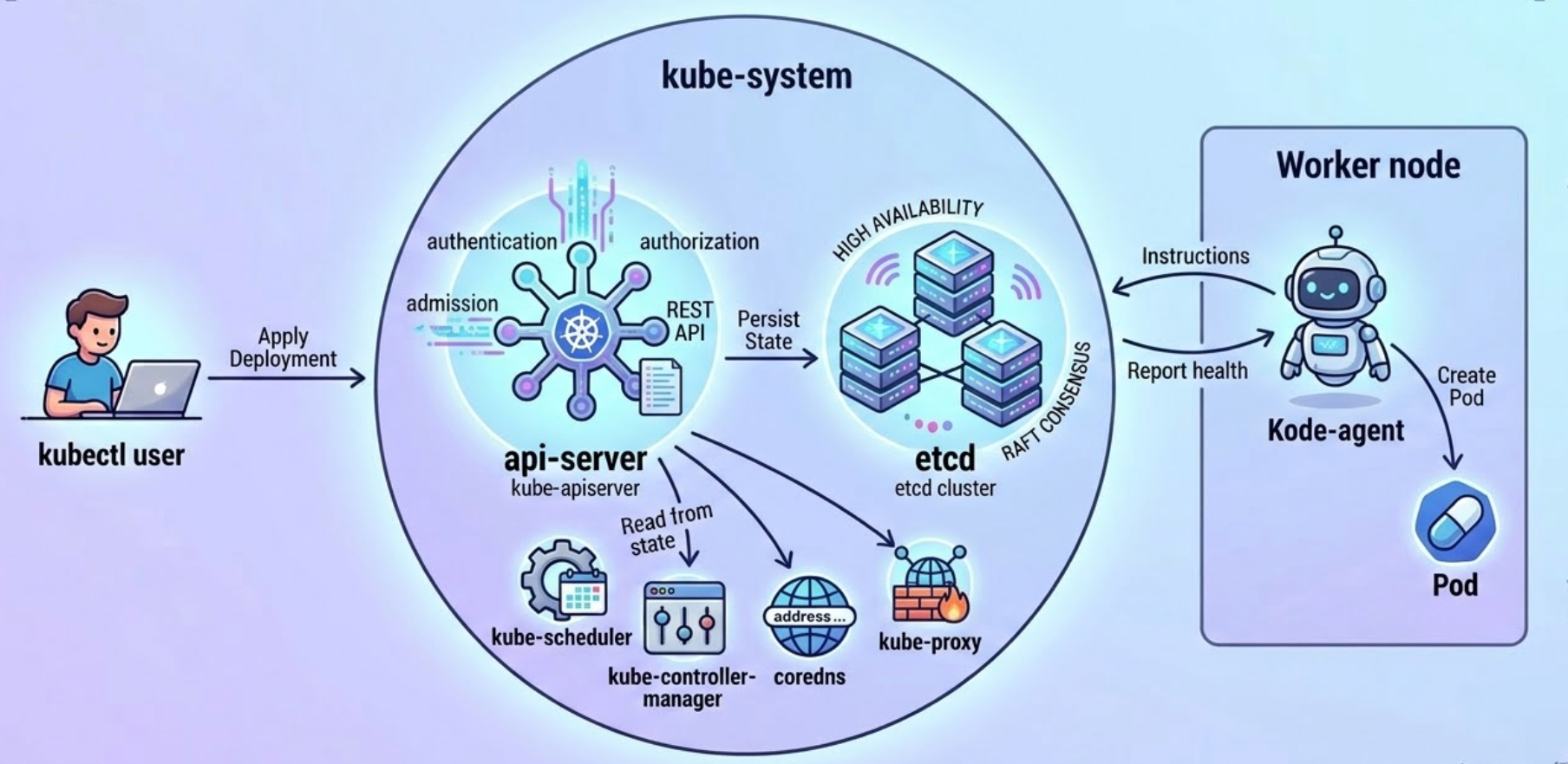 오늘 포스팅에서는 쿠버네티스의 핵심 중의 핵심인 kube-system 네임스페이스, 모든 요청의 게이트웨이 kube-apiserver, 그리고 클러스터의 상태를 저장하는 **etcd**에 대해 상세히 알아보고, 실제 실습을 통해 그 동작 과정을 눈으로 확인해 보겠습니다.